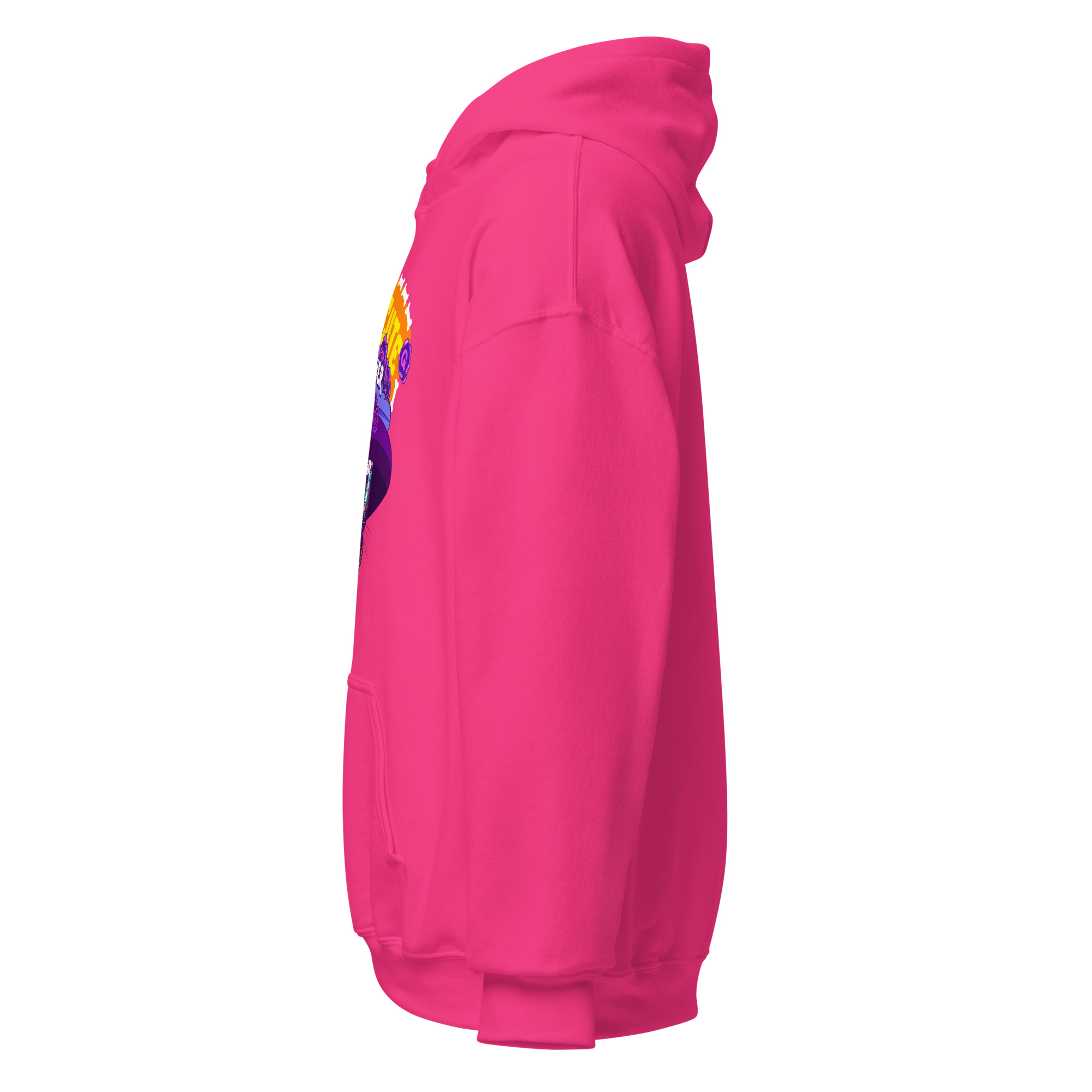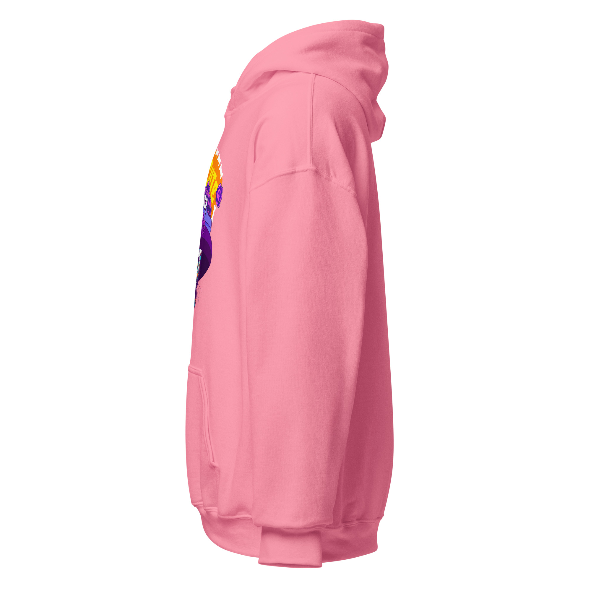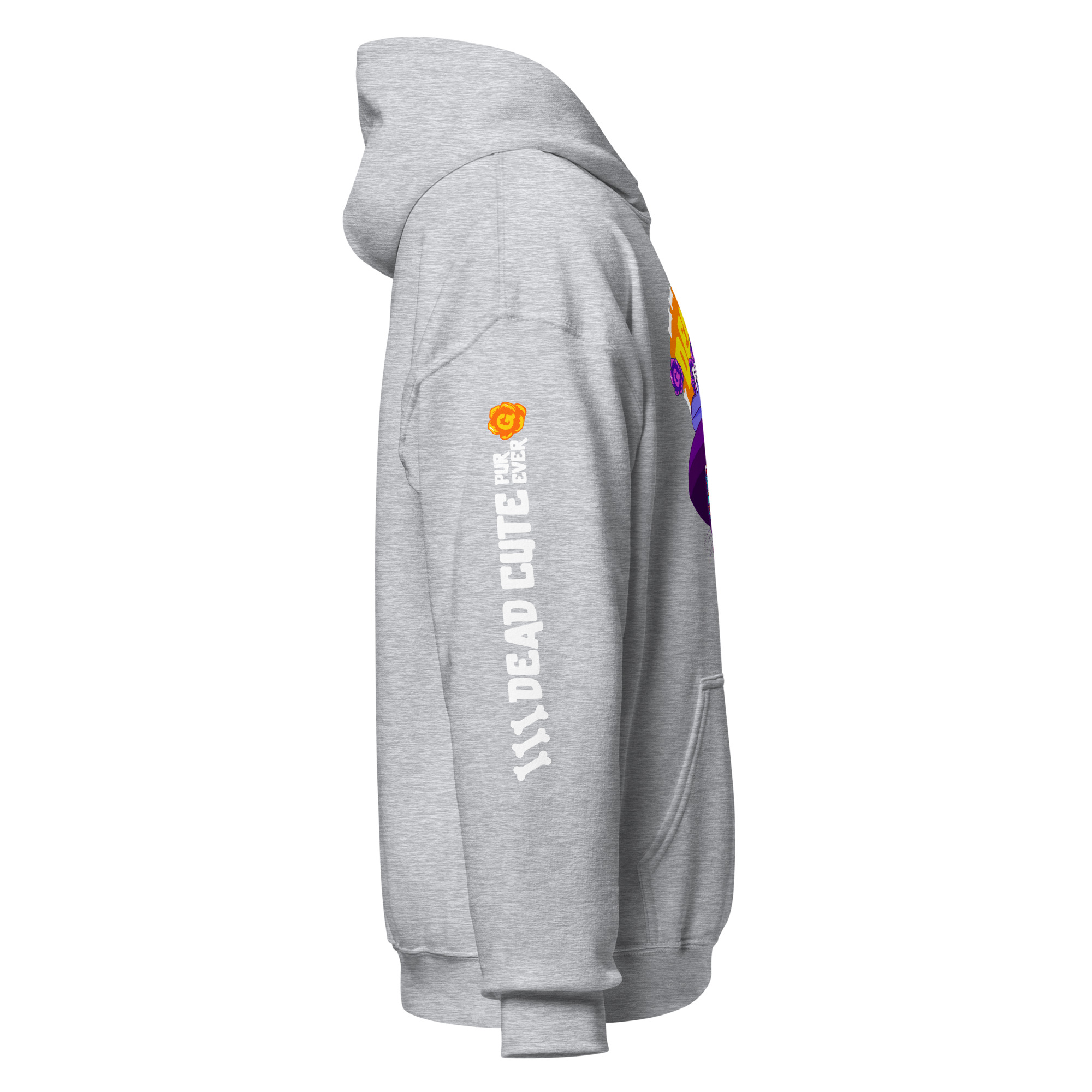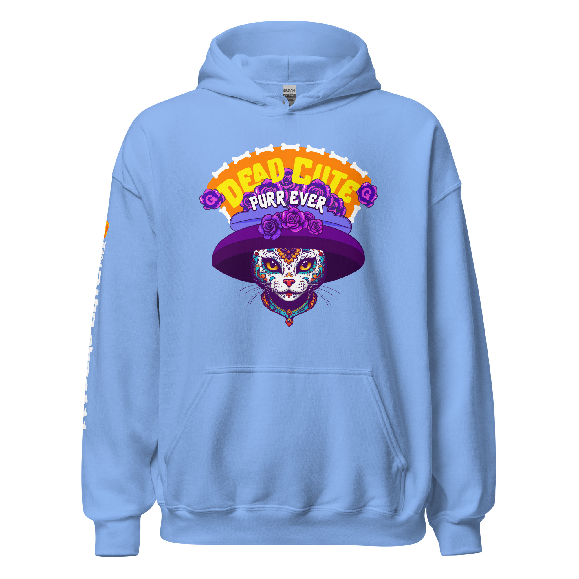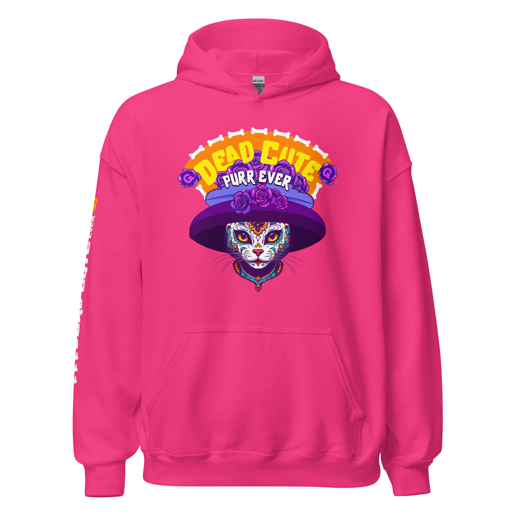 Be dead cute purr-ever. This Día de los Muertos–inspired hoodie features a sugar-skull cat in a wide purple hat surrounded by roses and bones—a design that celebrates feline sass and eternal cattitude.