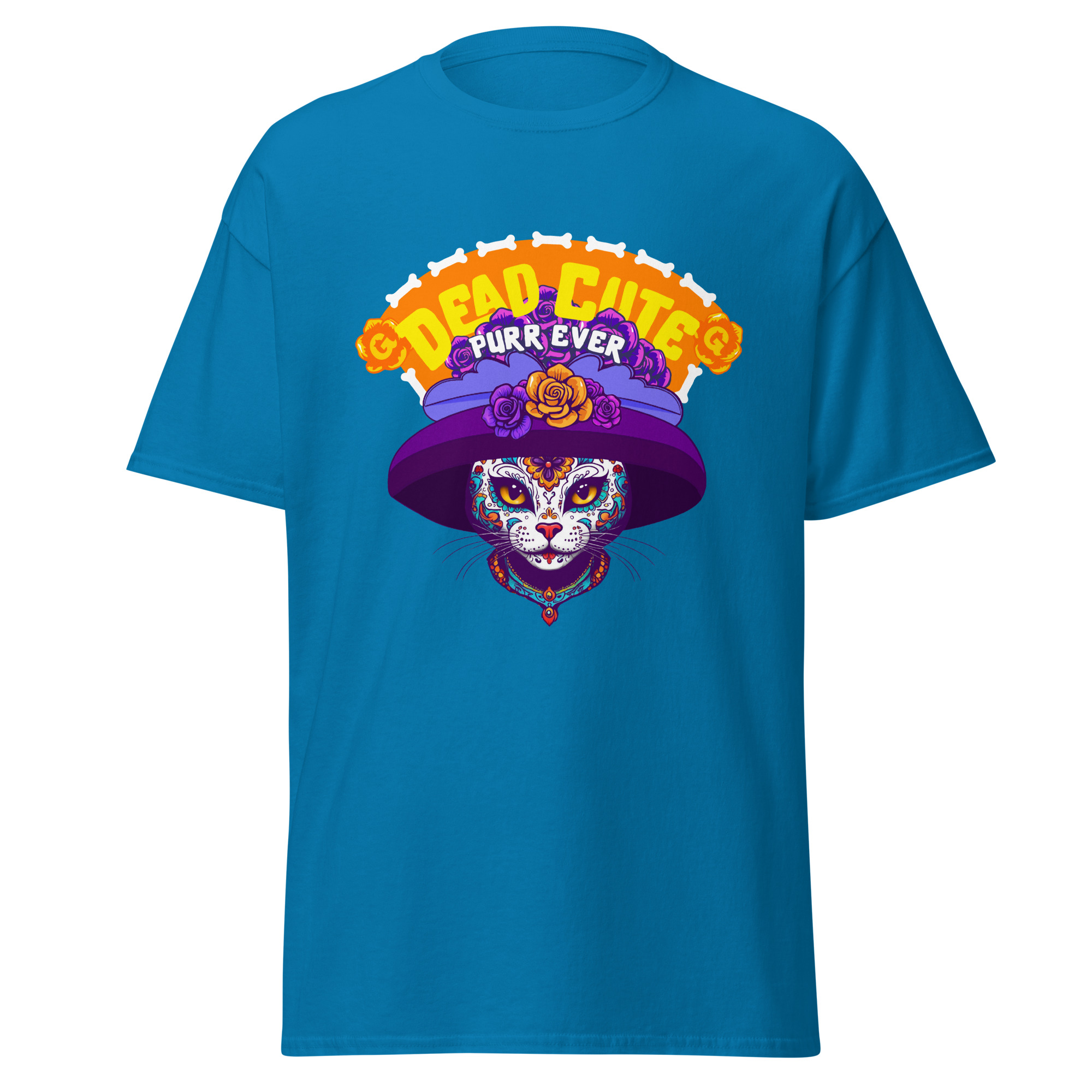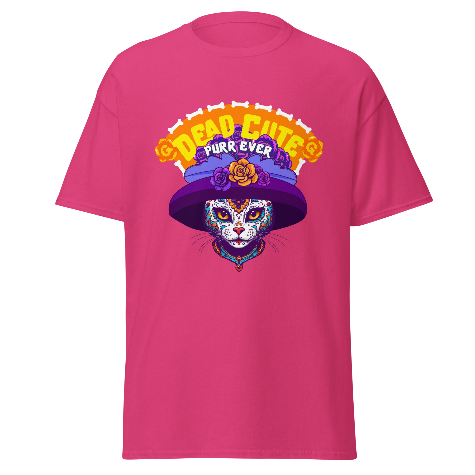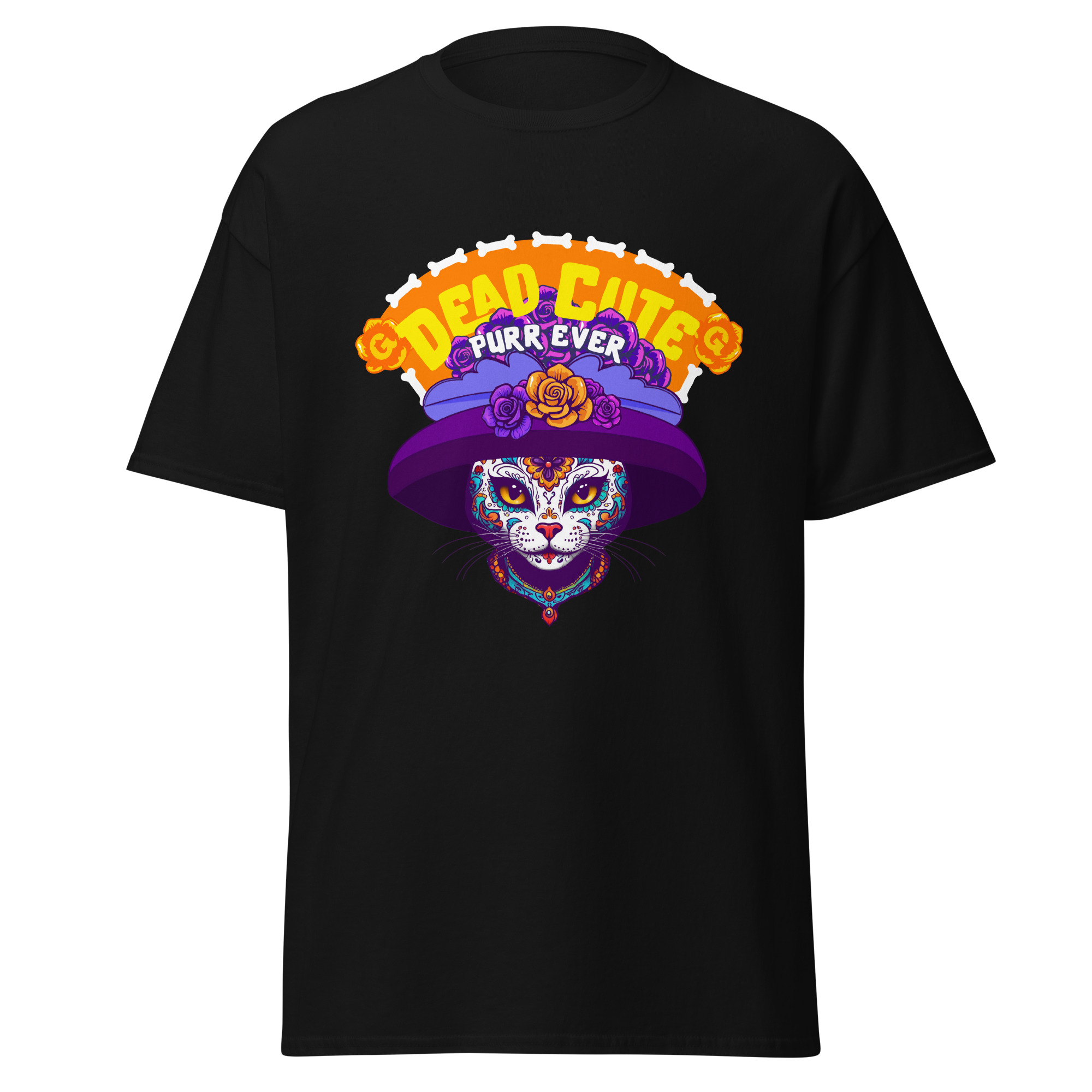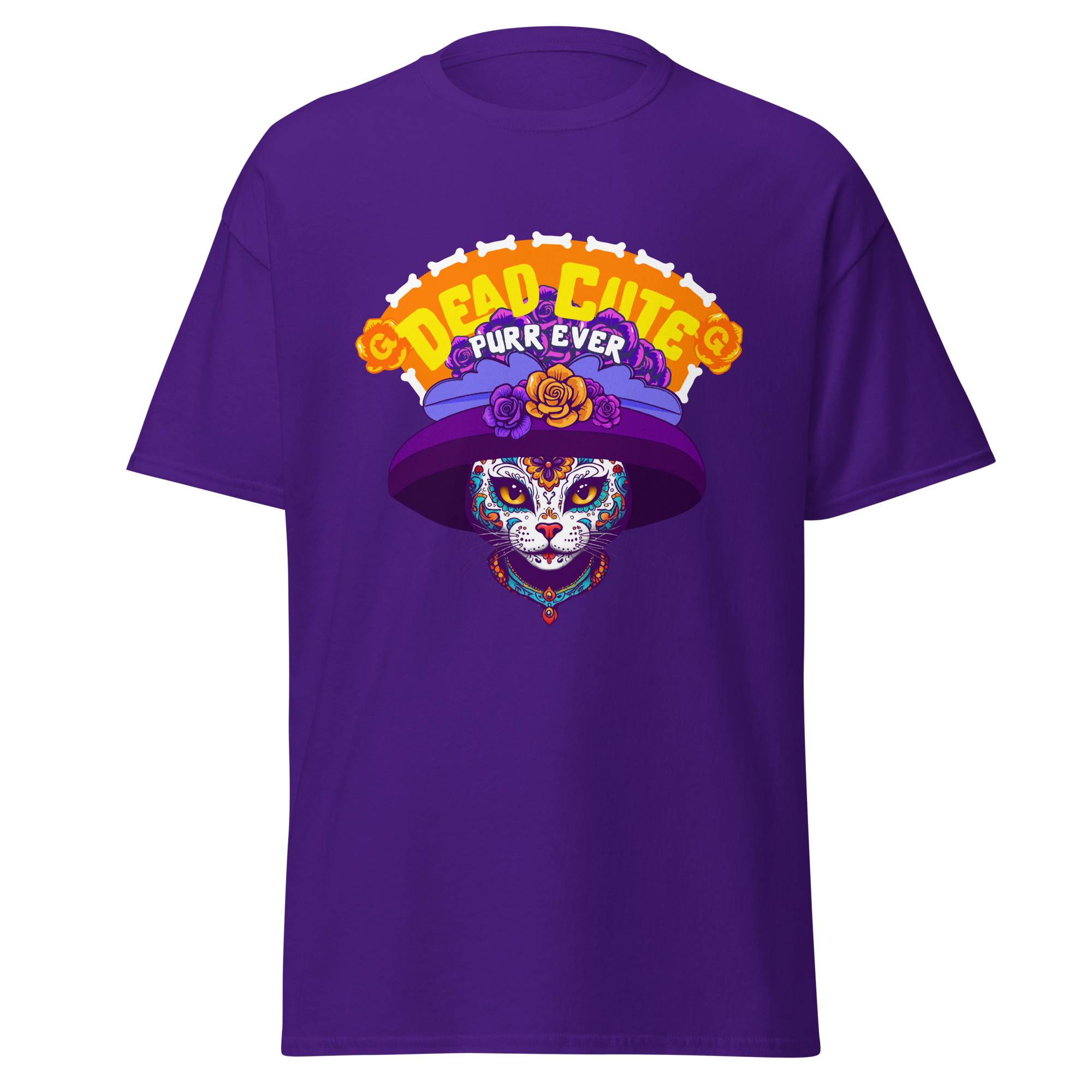 Cute, creepy, and totally cattastic—the Dead Cute Cat T-Shirt is proof that nine lives come with nine looks. This Día de los Muertos–inspired design features a sugar-skull kitty rocking a dramatic purple hat and roses, reminding the world that cat style is eternal.