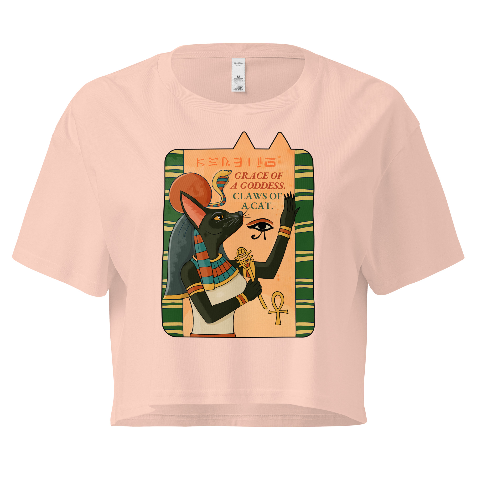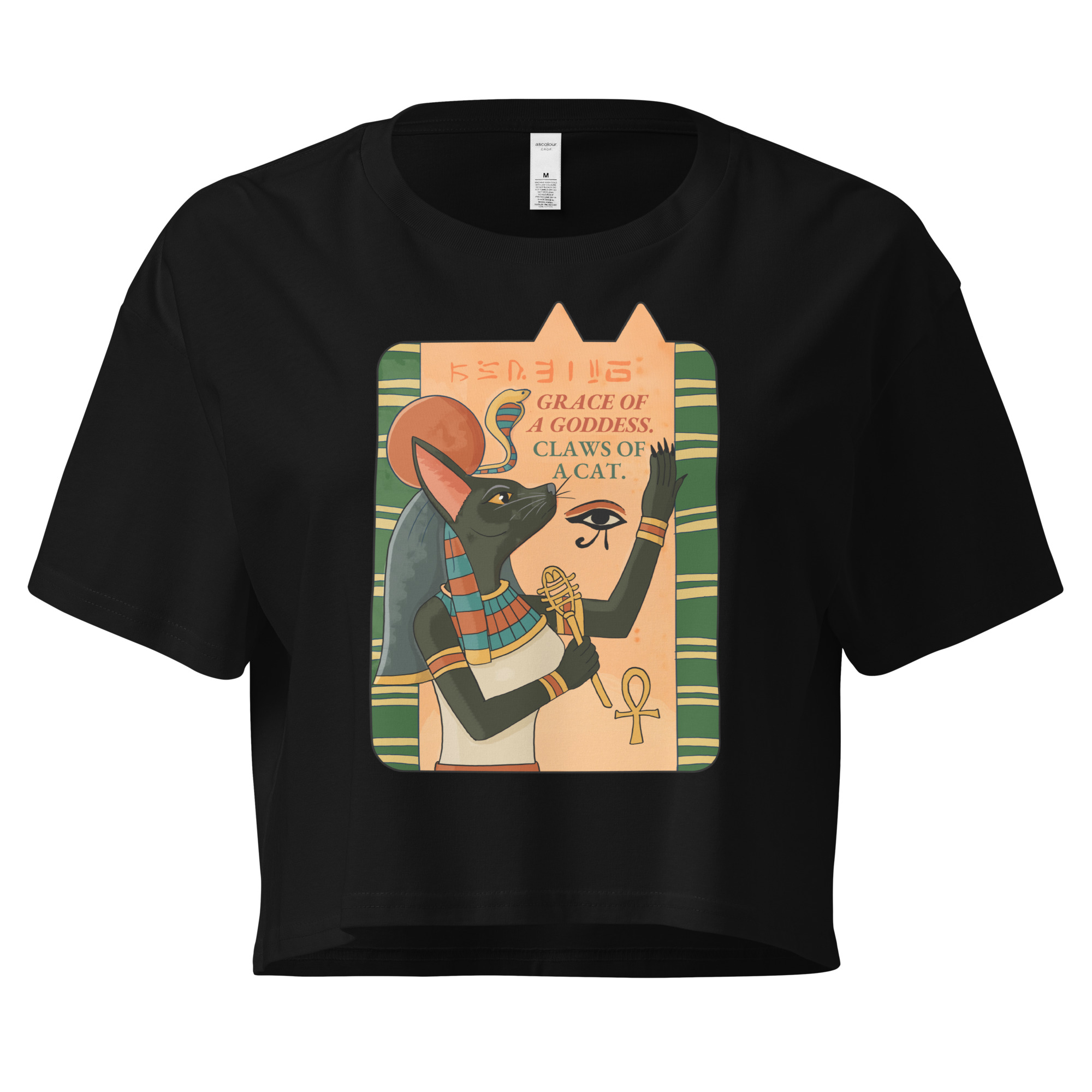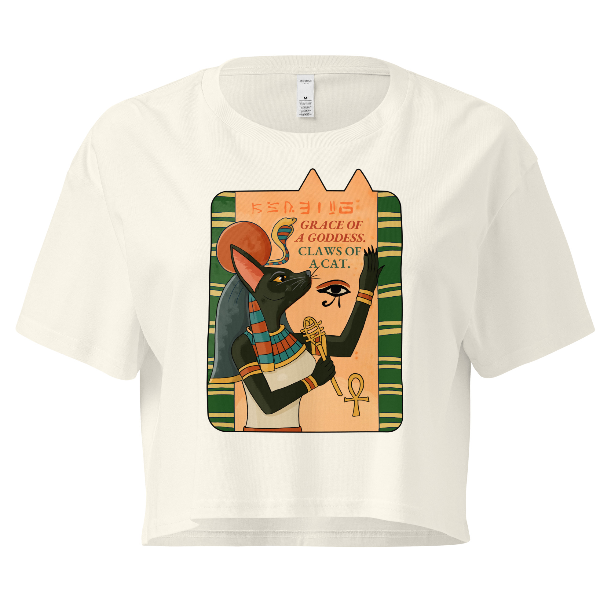 Channel divine power with the Deity Cat Women’s Crop Top, featuring the bold phrase ‘Grace of a goddess, claws of a cat.’ Perfect for cat lovers who like their style with a touch of myth and mischief, this Egyptian-inspired design celebrates feline strength and elegance.