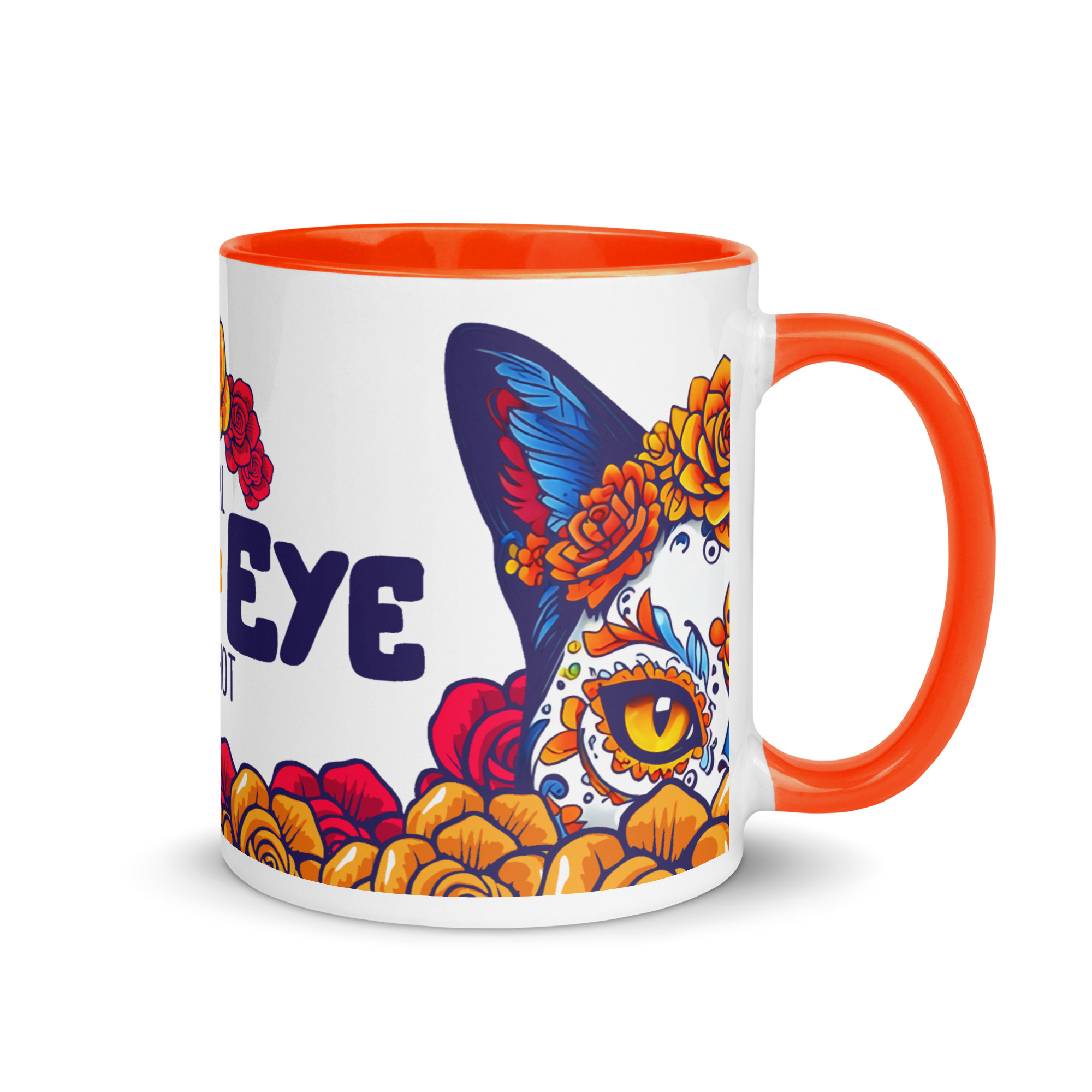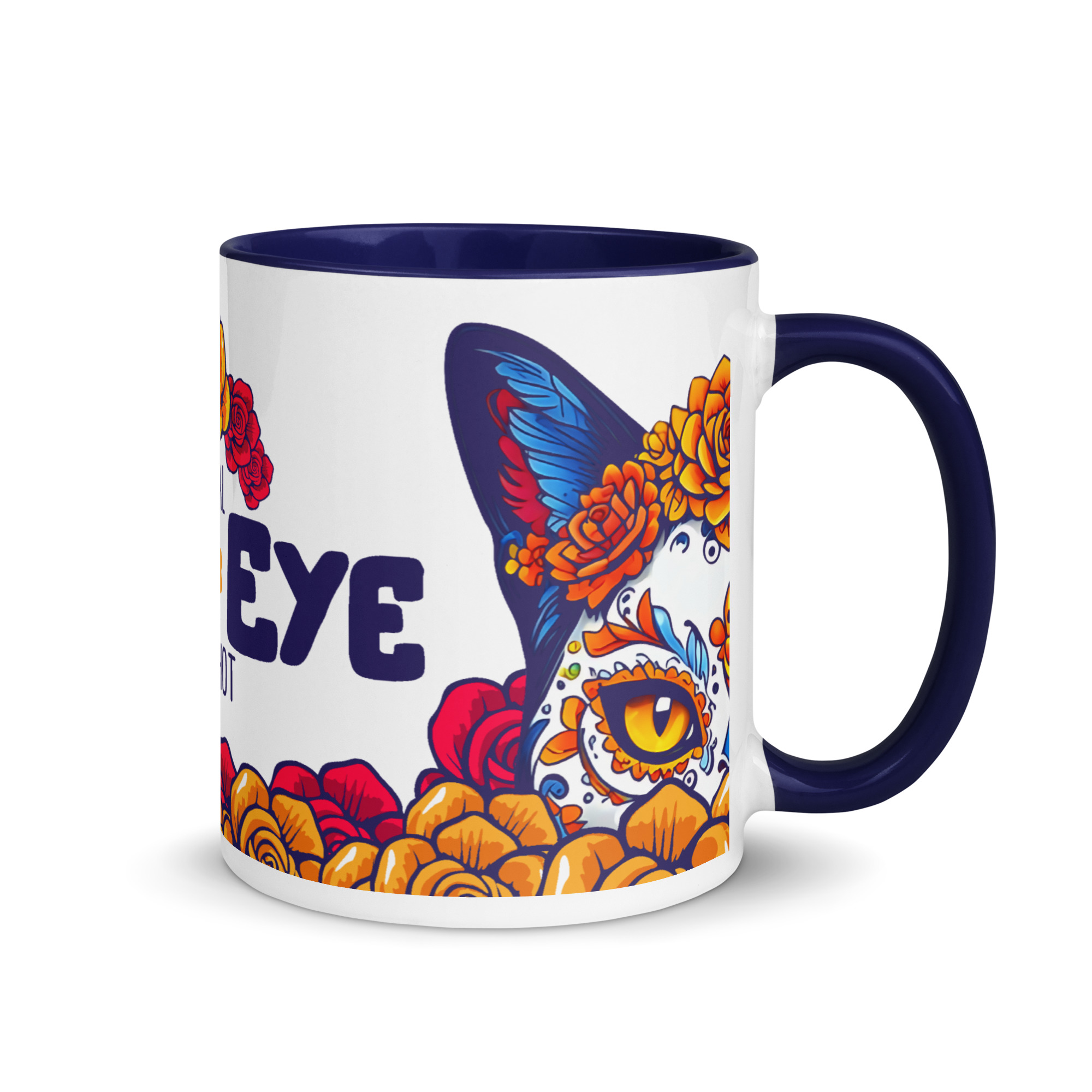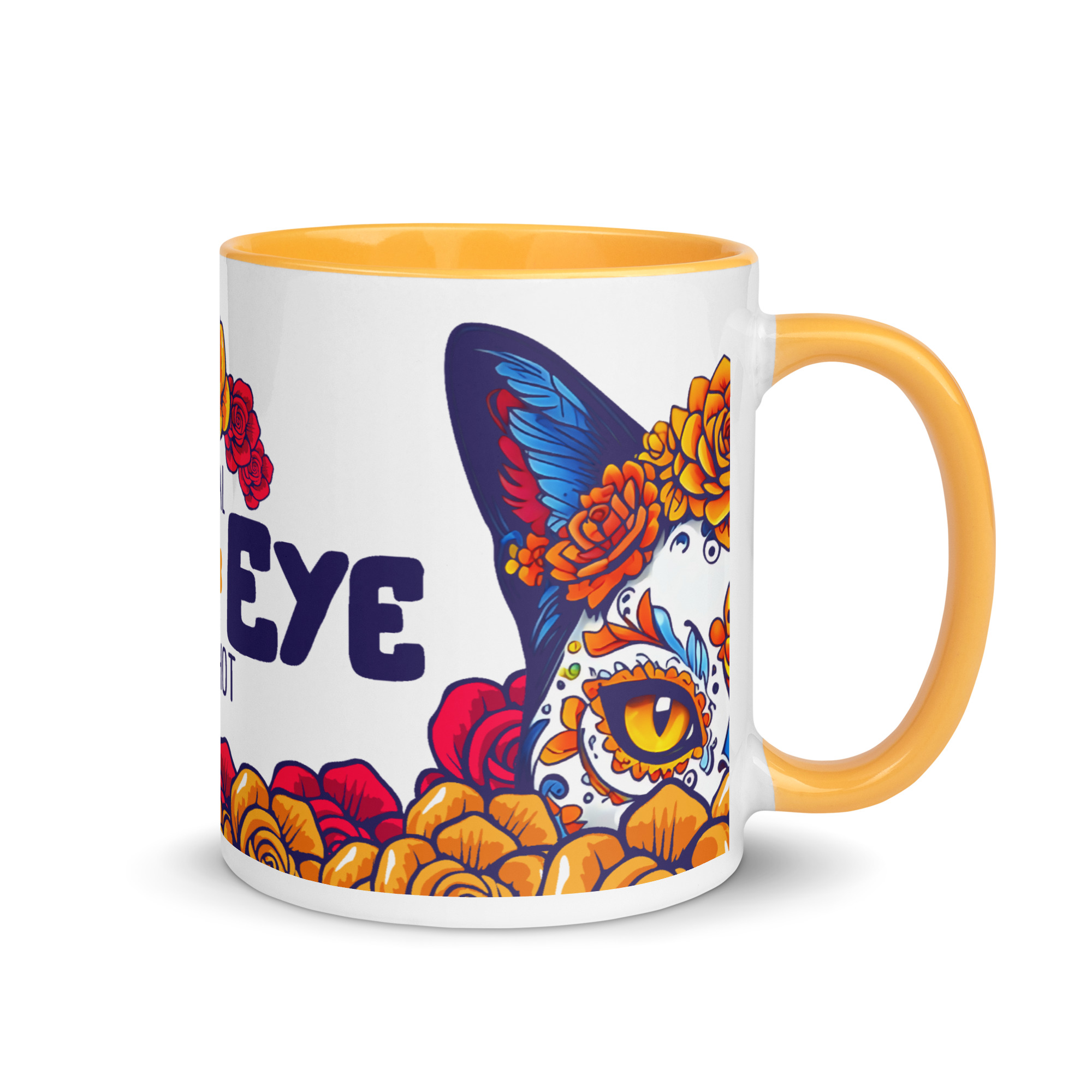 Hot coffee, hotter side-eye. The Eternal Side-Eye Cat Mug delivers caffeine with cattitude. Featuring a sugar-skull cat flashing its eternal side-eye, this Día de los Muertos–inspired design is printed on a glossy ceramic mug with a colorful rim, handle, and interior for extra flair.