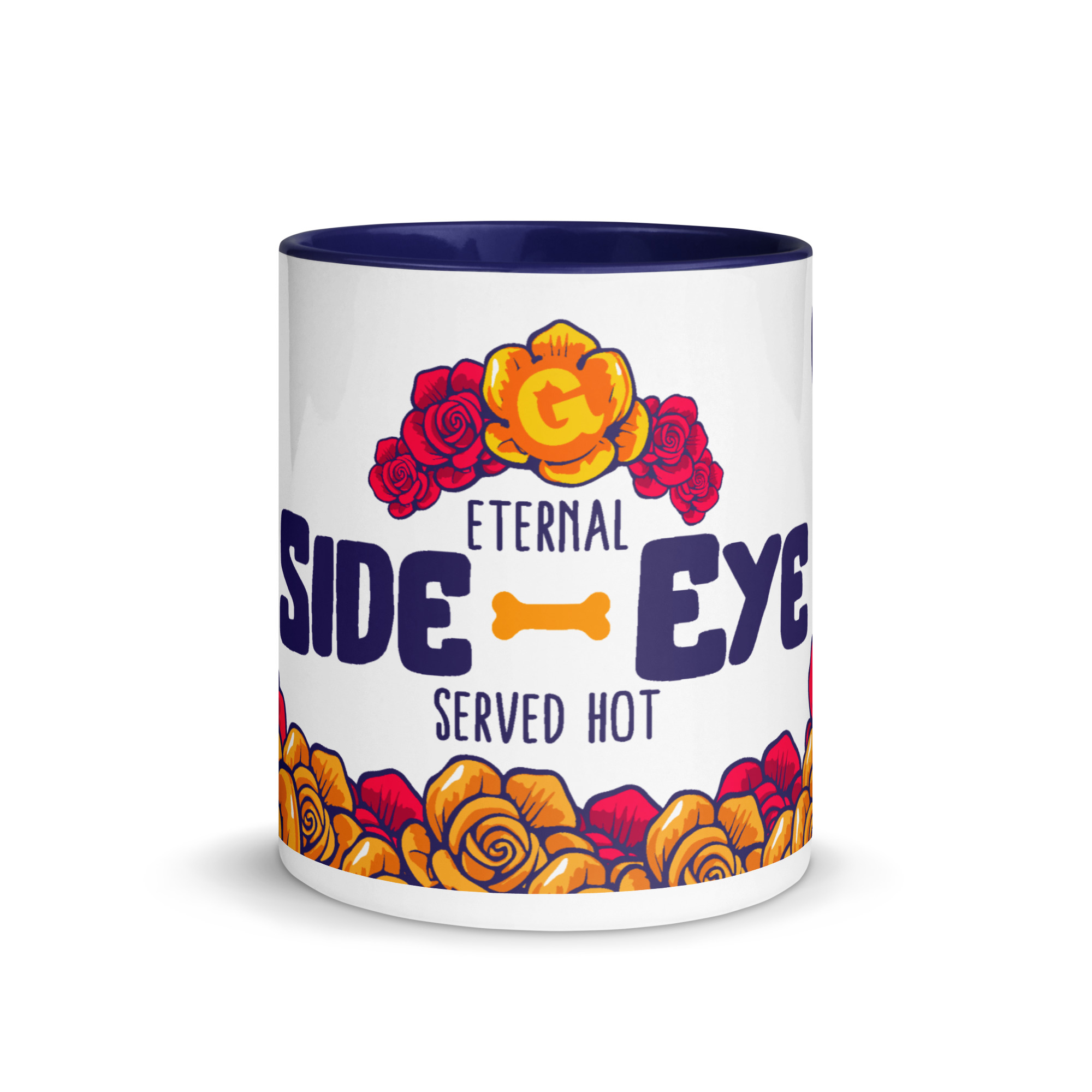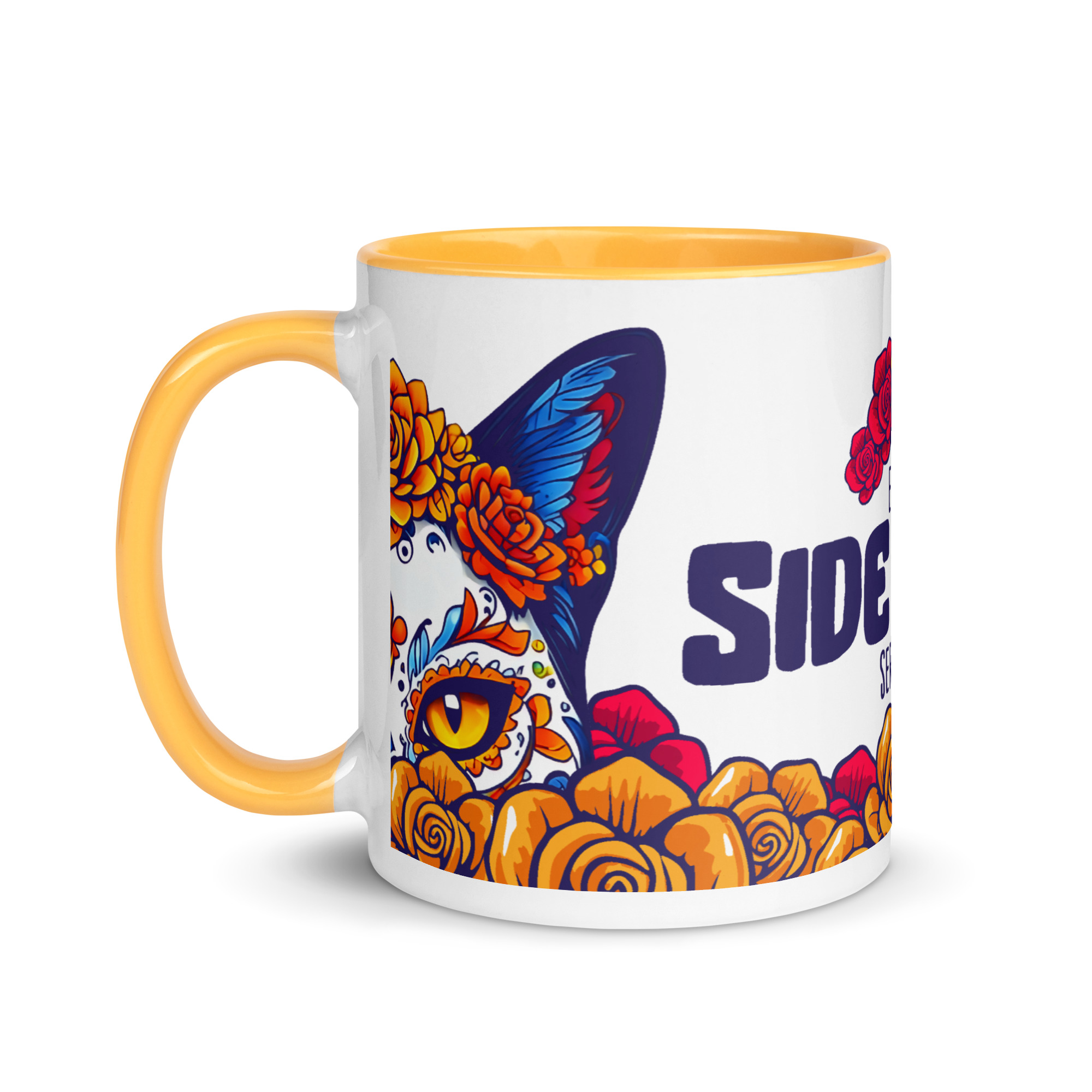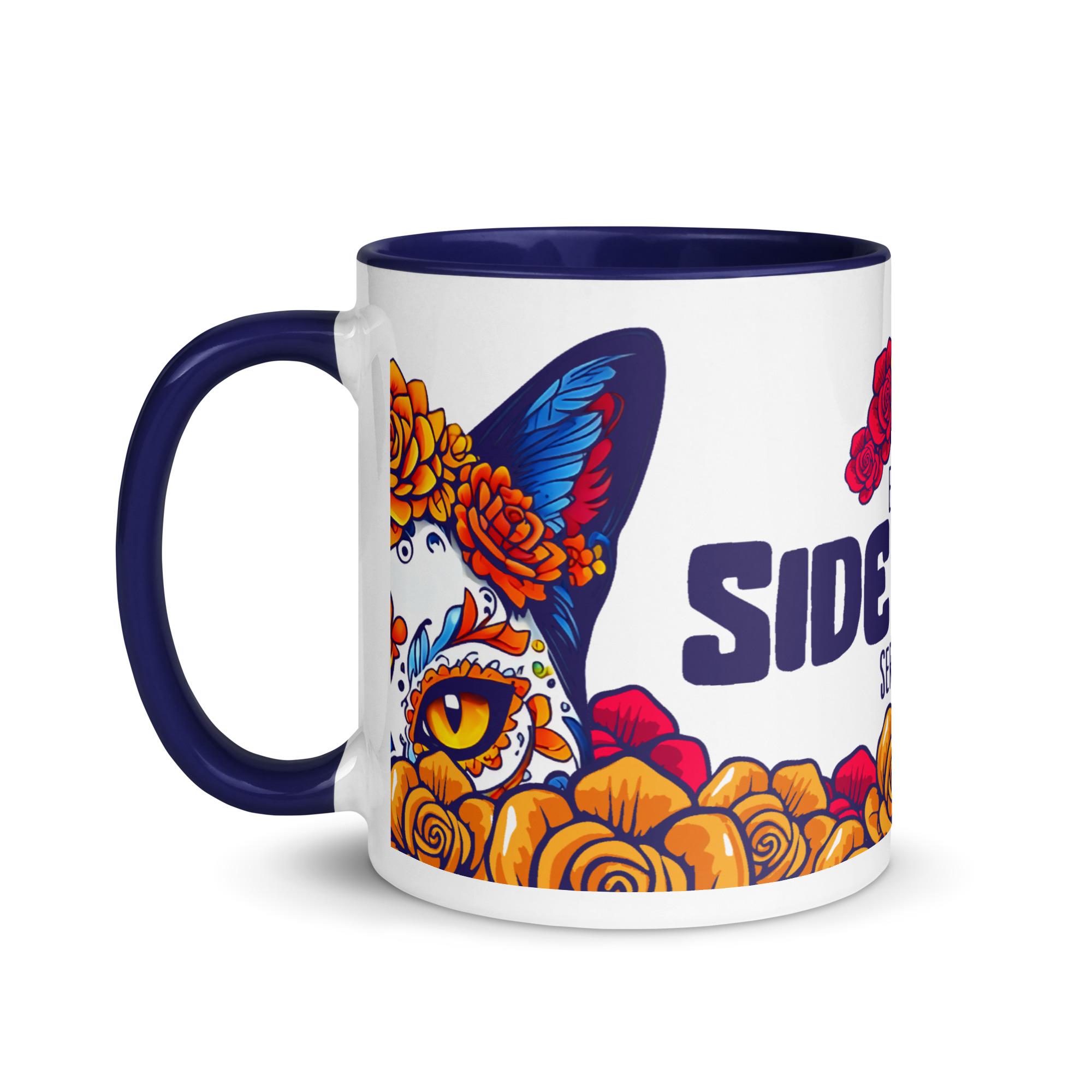 Hot coffee, hotter side-eye. The Eternal Side-Eye Cat Mug delivers caffeine with cattitude. Featuring a sugar-skull cat flashing its eternal side-eye, this Día de los Muertos–inspired design is printed on a glossy ceramic mug with a colorful rim, handle, and interior for extra flair.