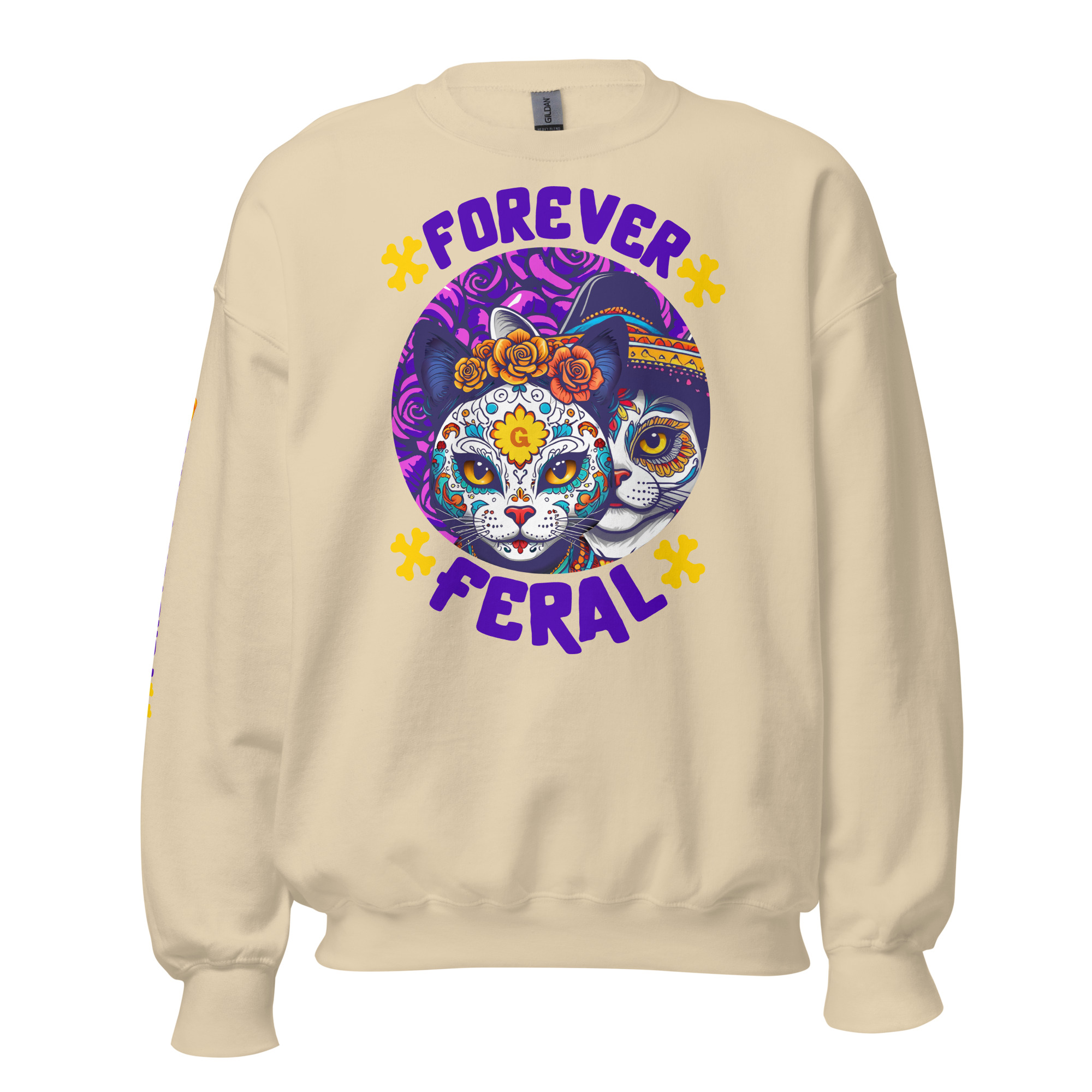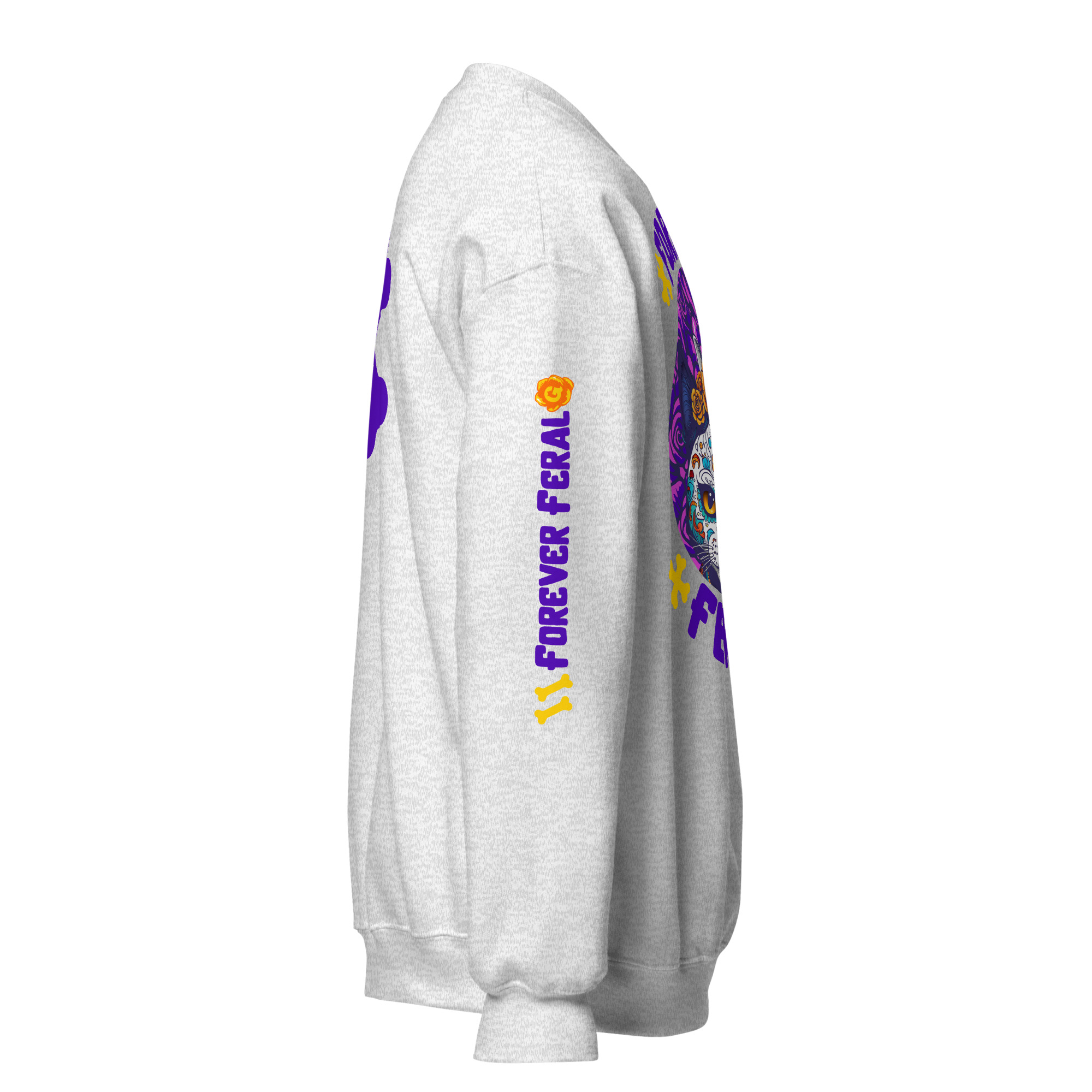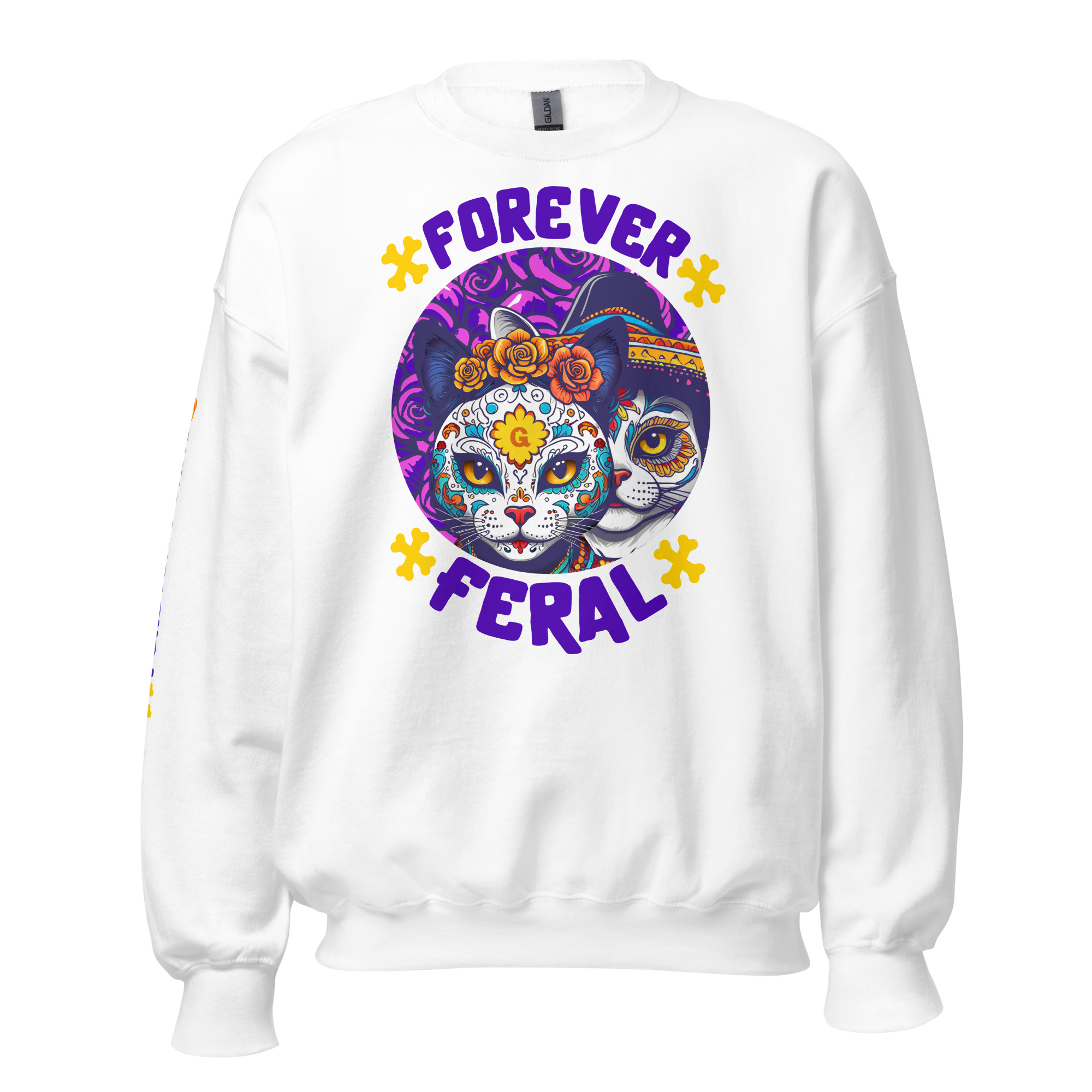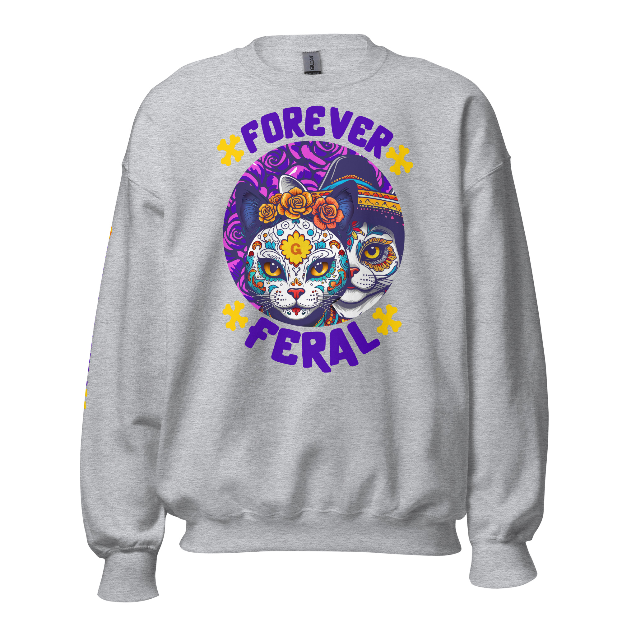 Cozy, durable crewneck with bold ‘Forever Feral’ cat art—wear your cattitude. 15% of sales support rescue cats.