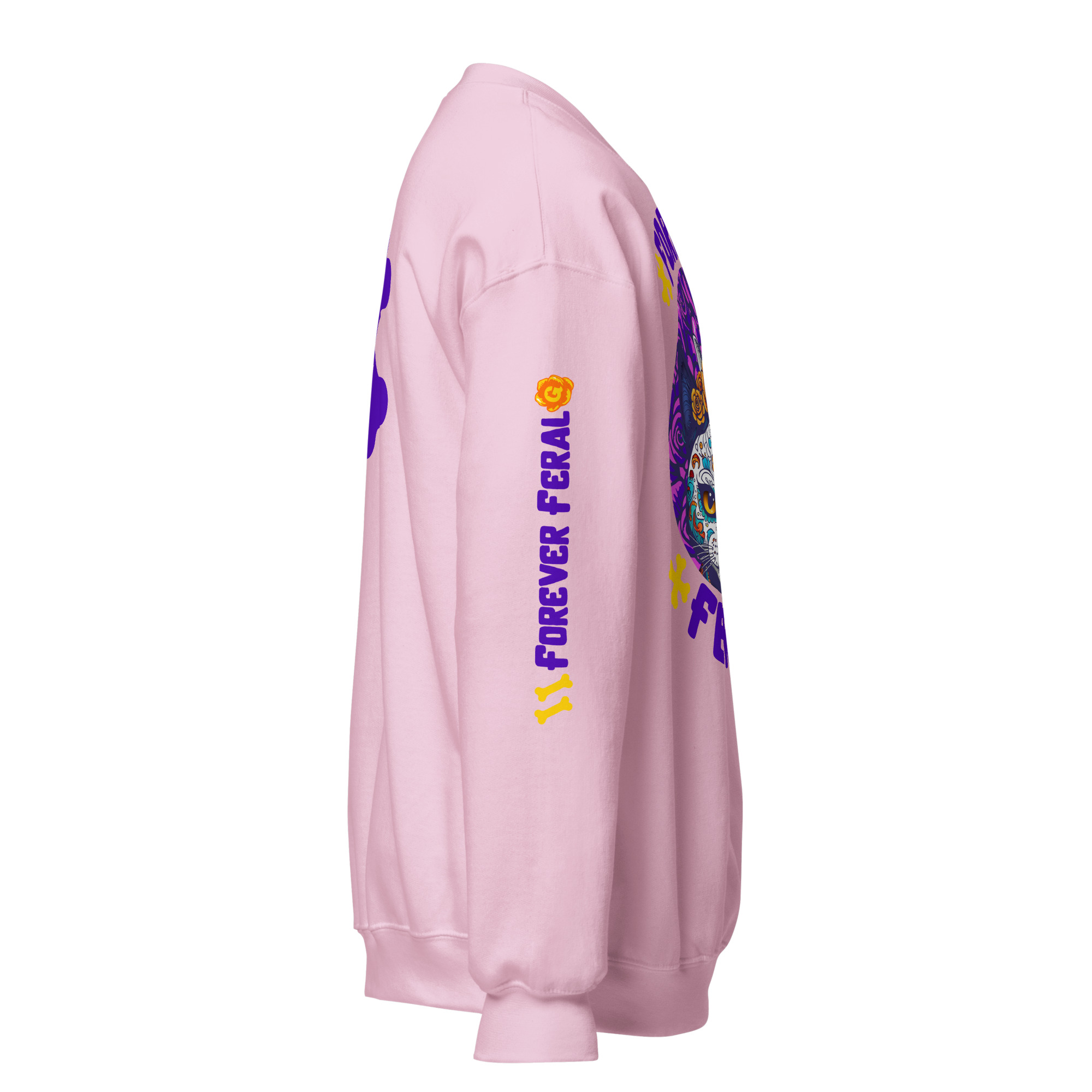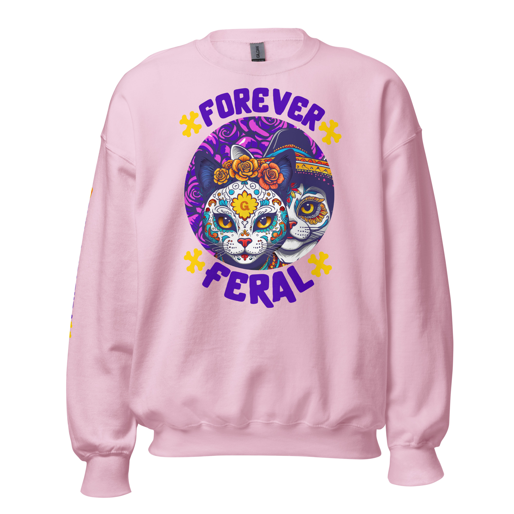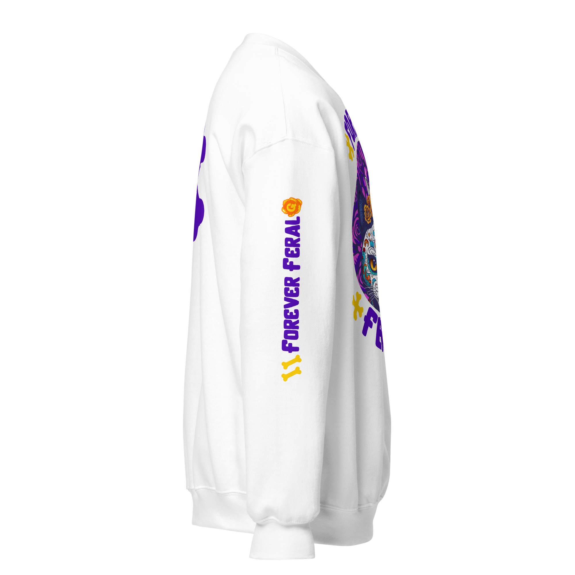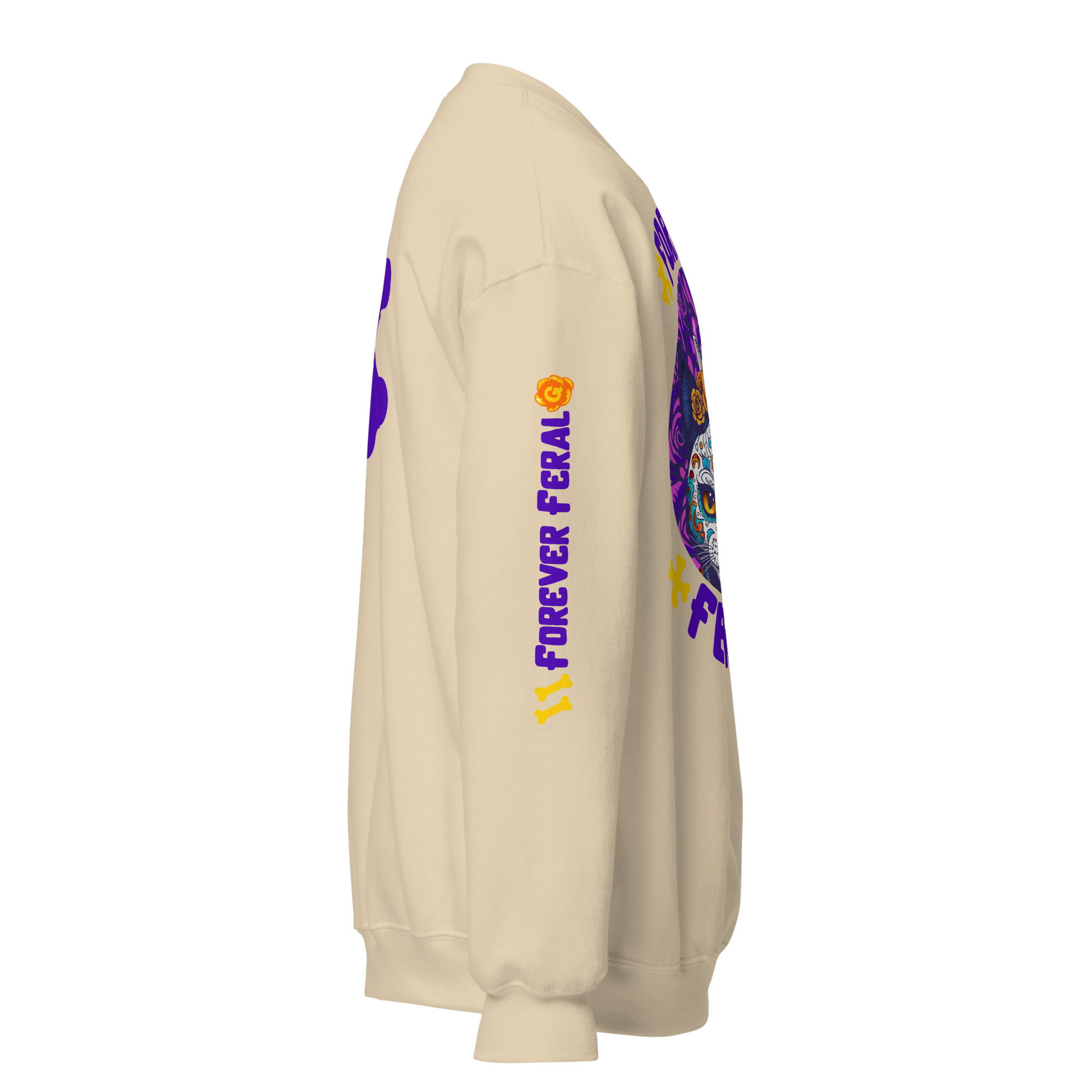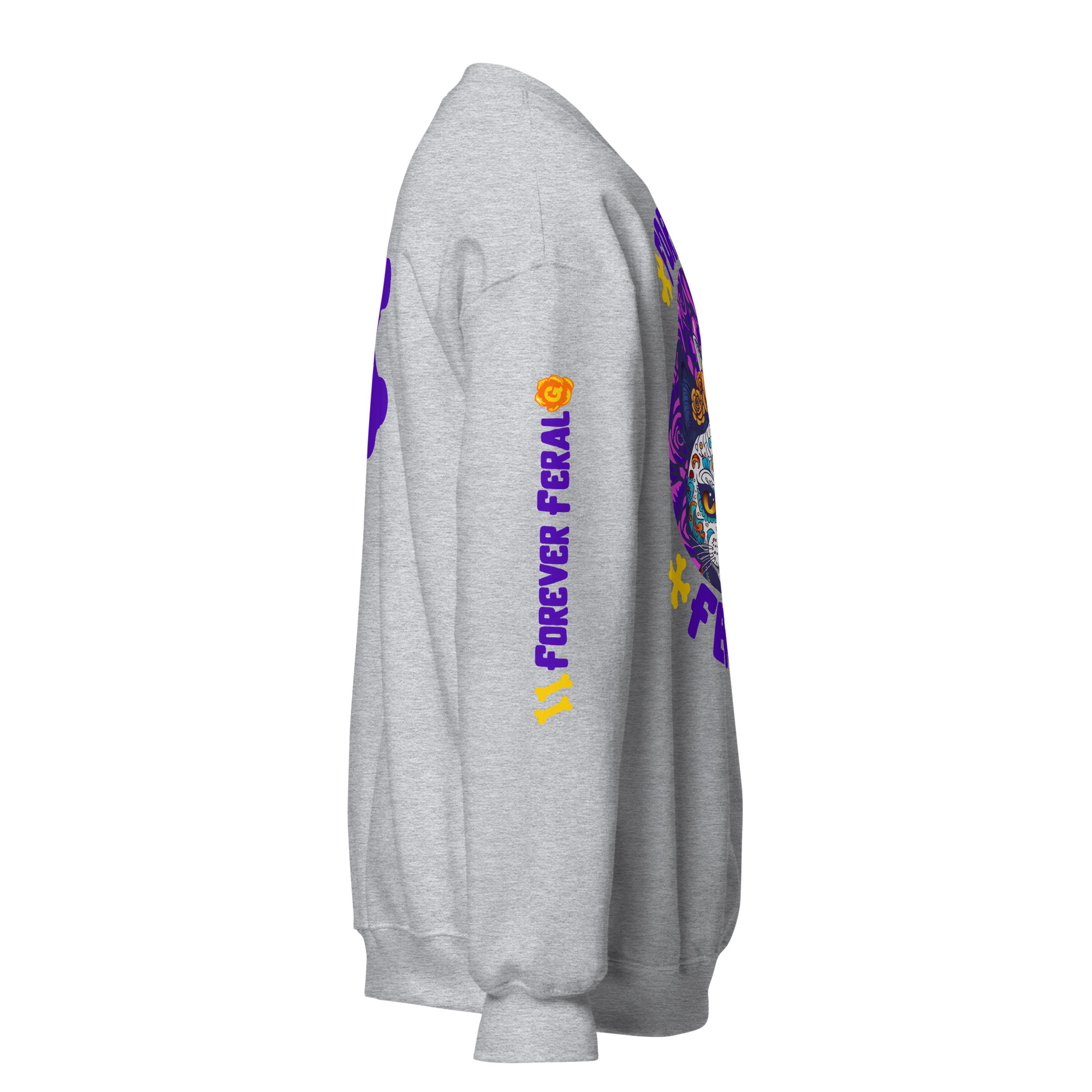 Cozy, durable crewneck with bold ‘Forever Feral’ cat art—wear your cattitude. 15% of sales support rescue cats.