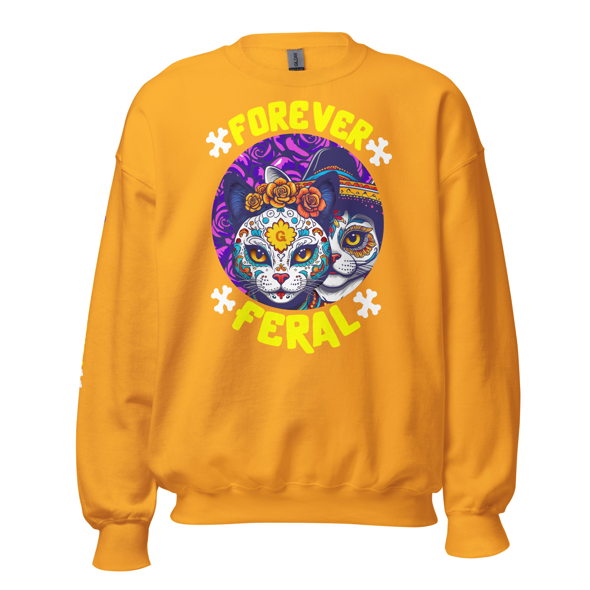 Cozy, durable crewneck with bold ‘Forever Feral’ cat art—wear your cattitude. 15% of sales support rescue cats.