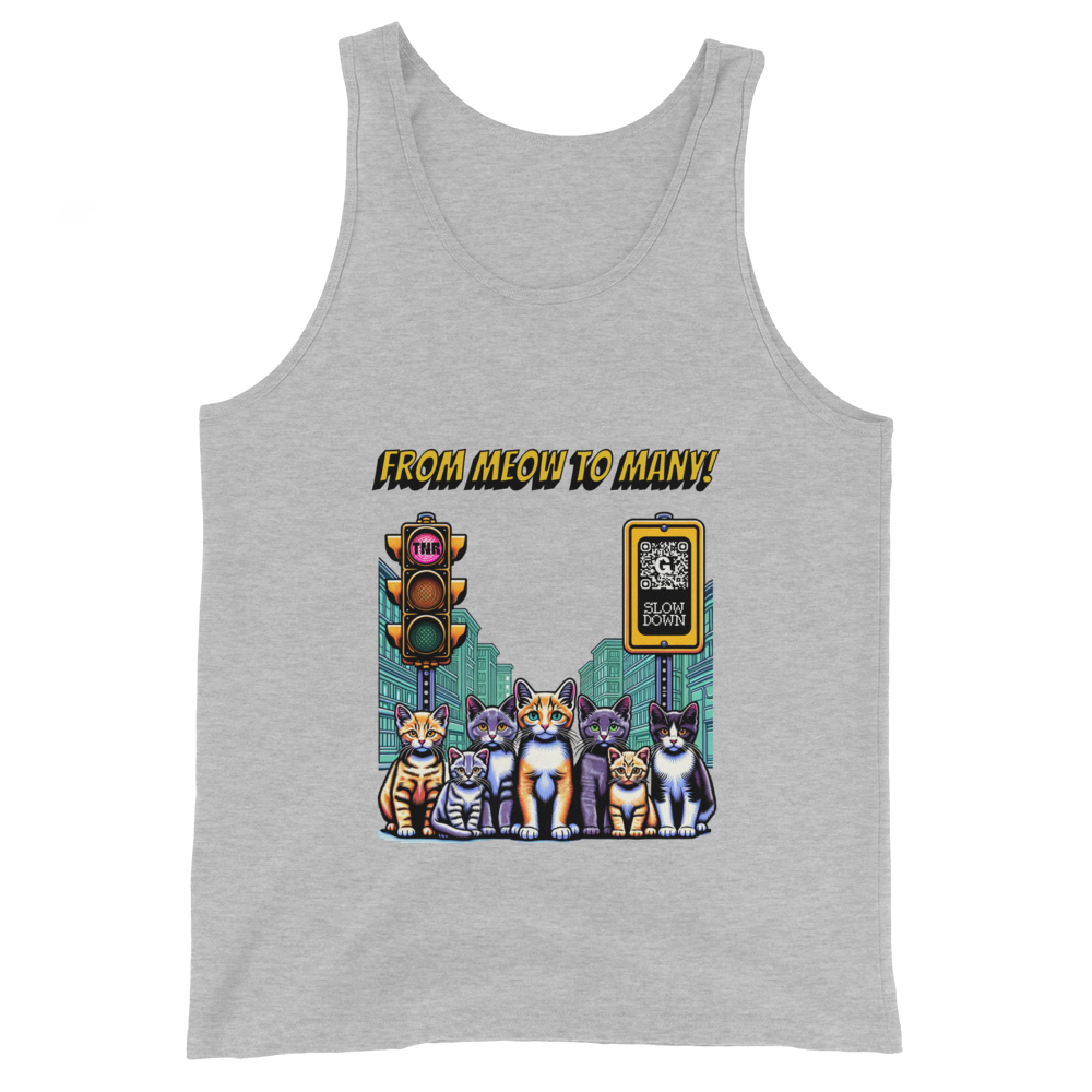 This men’s cat rescue tank top features the bold “From Meow to Many” graphic with a scannable QR code that links to an educational blog post about TNR (Trap-Neuter-Return). A breathable, bold way to raise awareness without breaking a sweat.