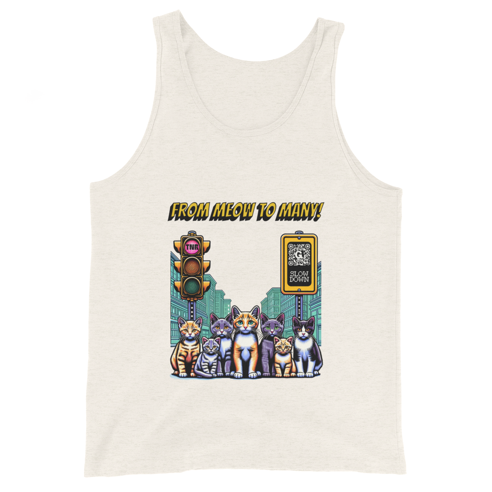 Whether you’re trapping in the summer sun or just out flexing your cat rescue credentials, the From Meow to Many men’s tank top is made to keep you cool while making a statement. This comic-style design stops traffic—literally—with a street scene of cats halted at a TNR traffic light next to a billboard that reads Slow Down the Flow.
