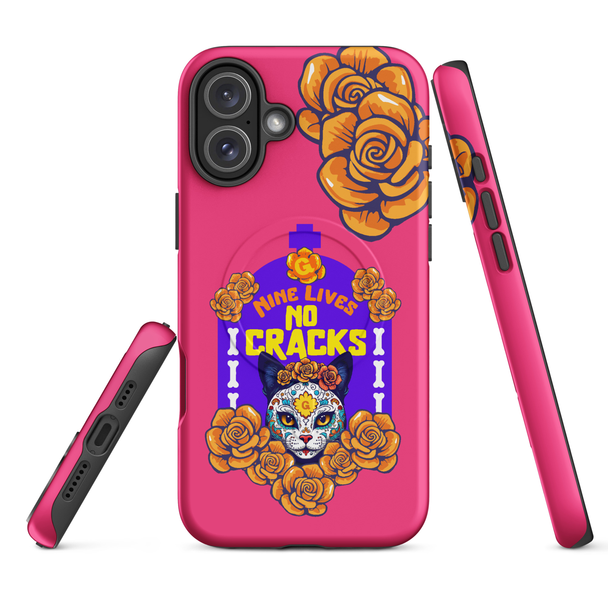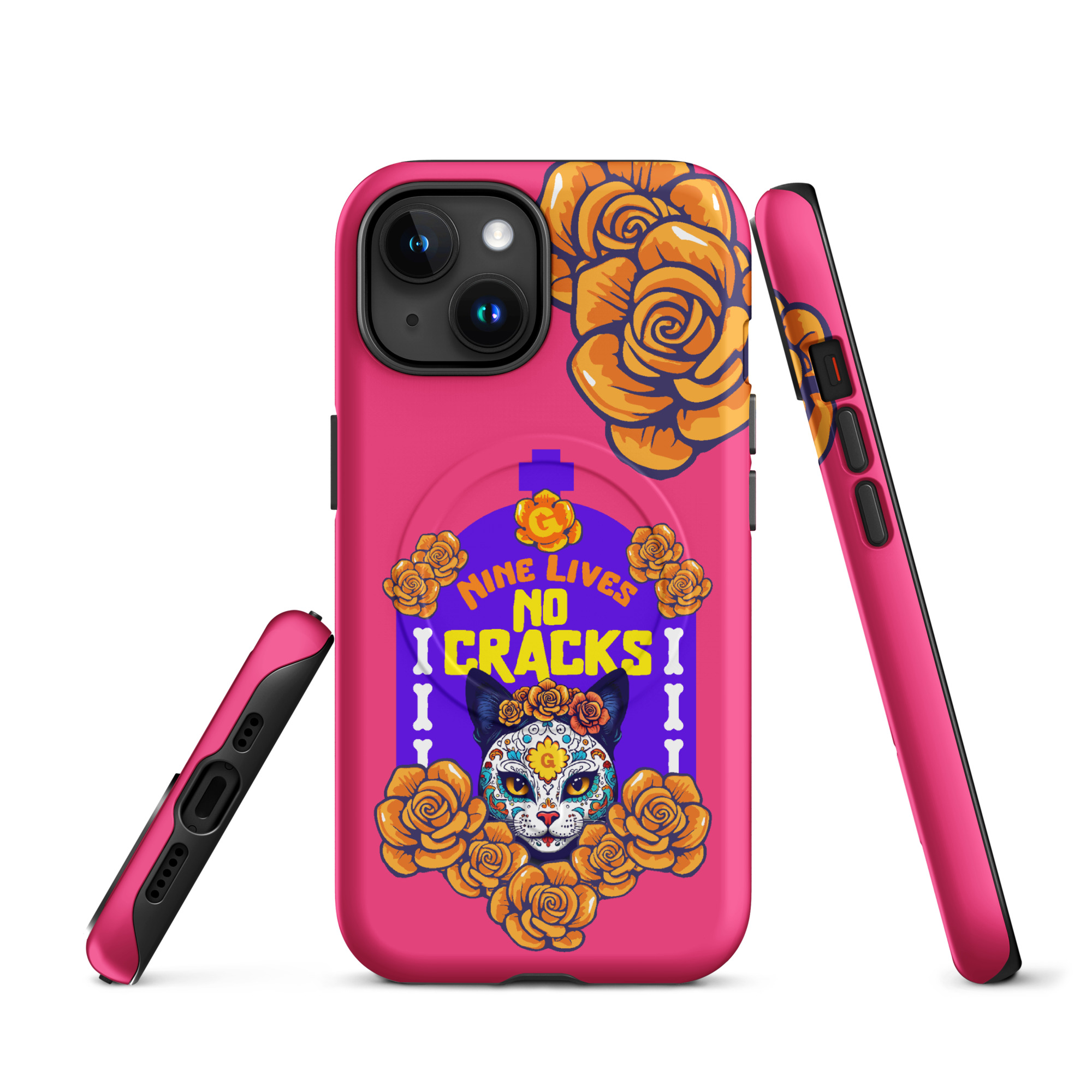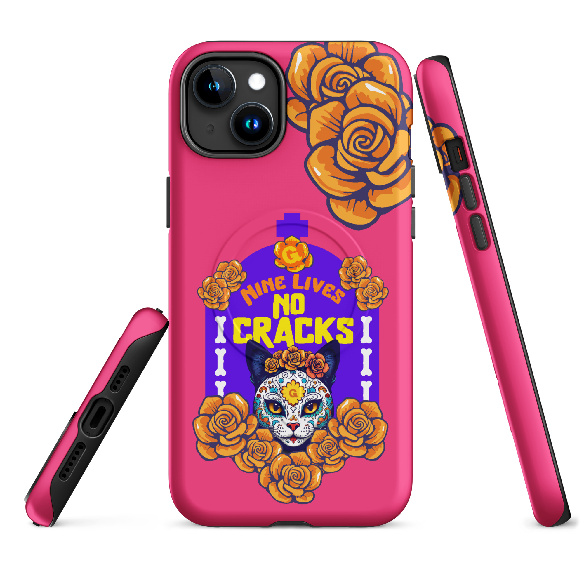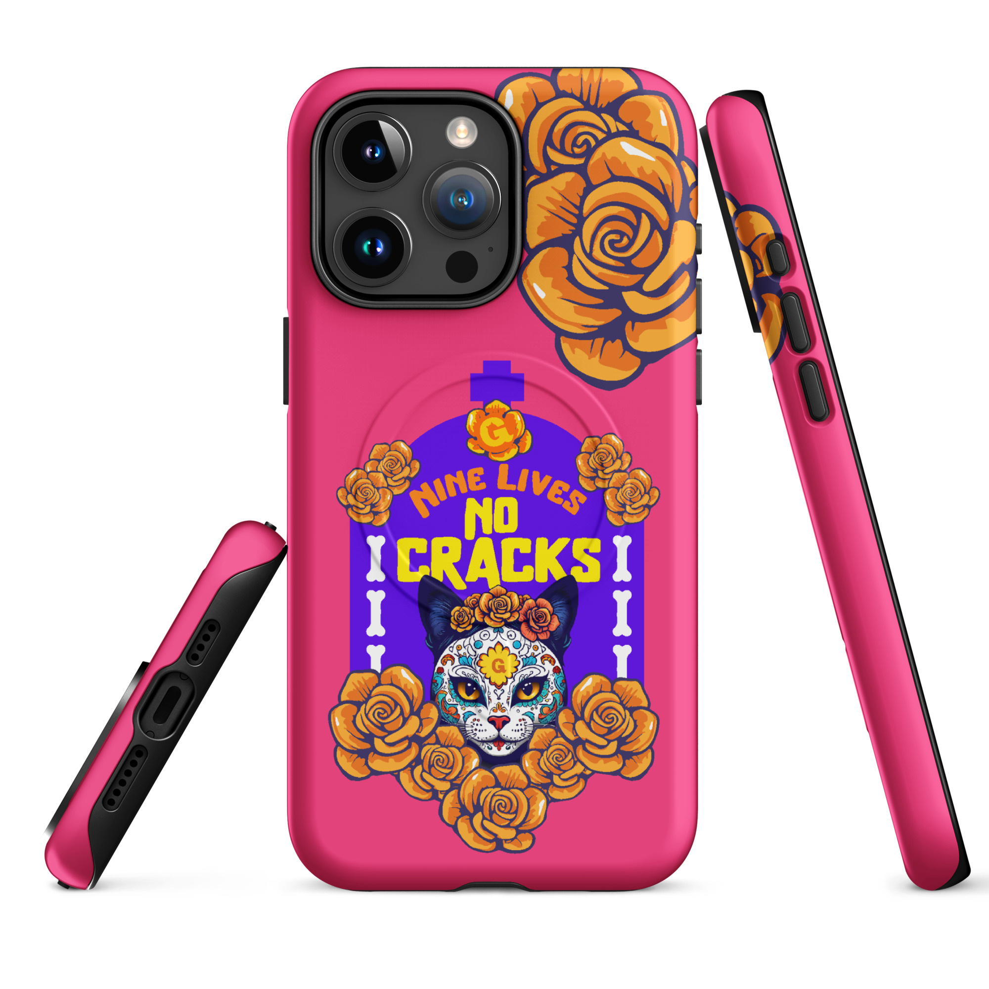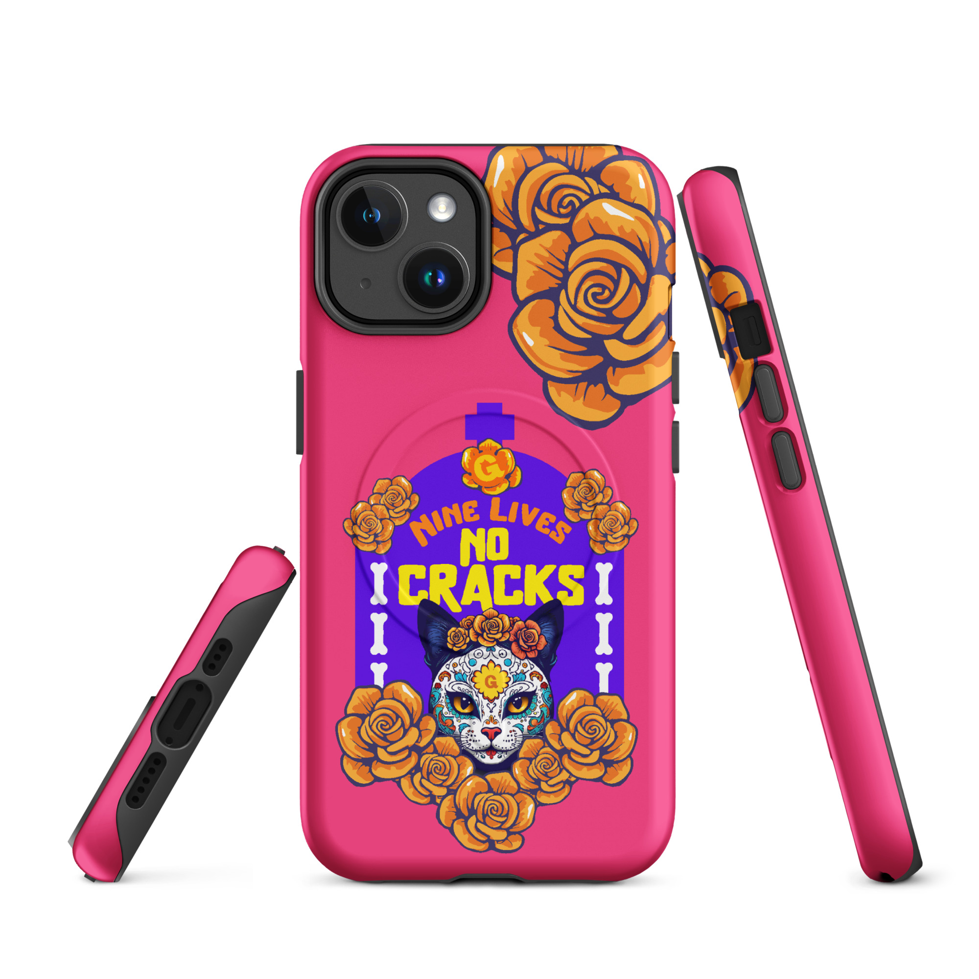 Cracks are for bad jokes, not your phone. Meet the Nine Lives, No Cracks Cat iPhone® Tough Case—built for clumsy paws, two-legged or four. With a dual-layer polycarbonate shell and TPU inner lining, it laughs in the face of drops, tumbles, and “oops, I knocked it off the counter” moments. The snug fit keeps buttons responsive, while MagSafe® compatibility means you can charge without the hassle. Decorated with our Día de los Muertos–inspired cat skull design, this case brings bold protection with nine lives of style.