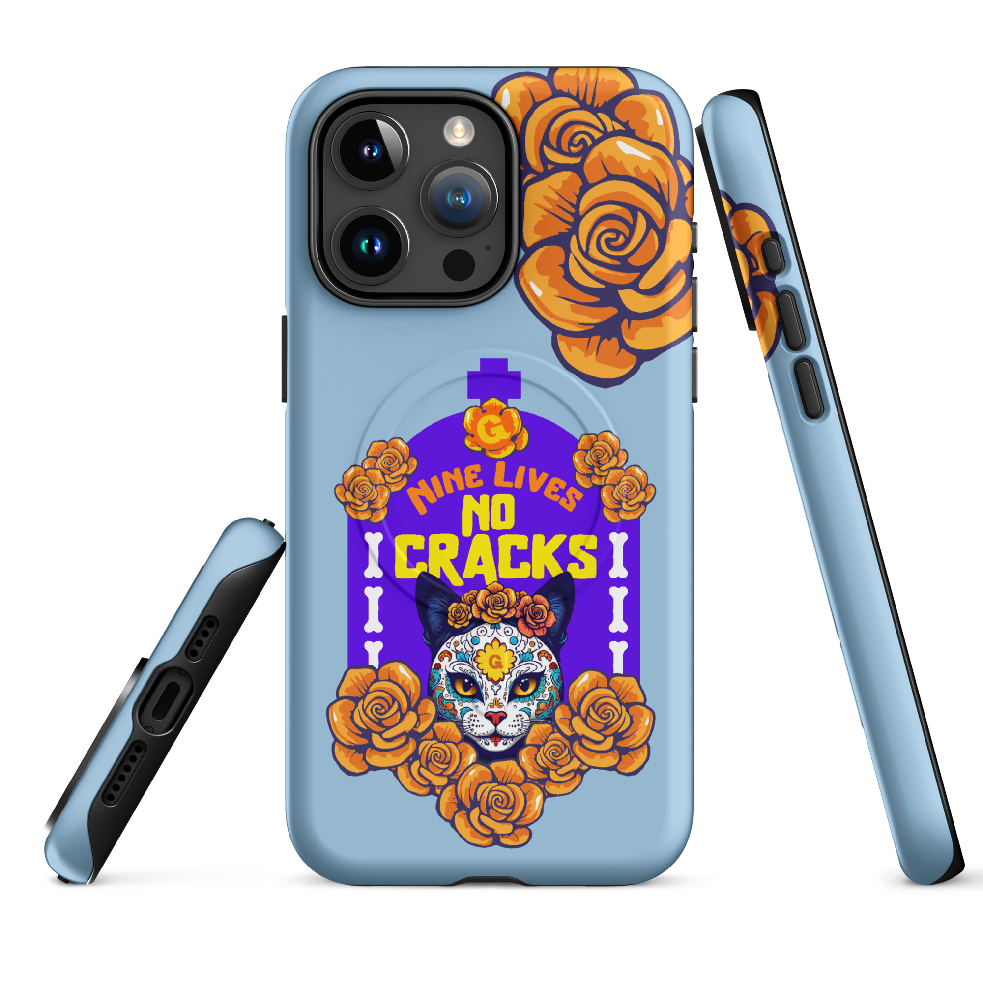 With a dual-layer polycarbonate shell and TPU inner lining, it laughs in the face of drops, tumbles, and “oops, I knocked it off the counter” moments. The snug fit keeps buttons responsive, while MagSafe® compatibility means you can charge without the hassle. Decorated with our Día de los Muertos–inspired cat skull design, this case brings bold protection with nine lives of style.