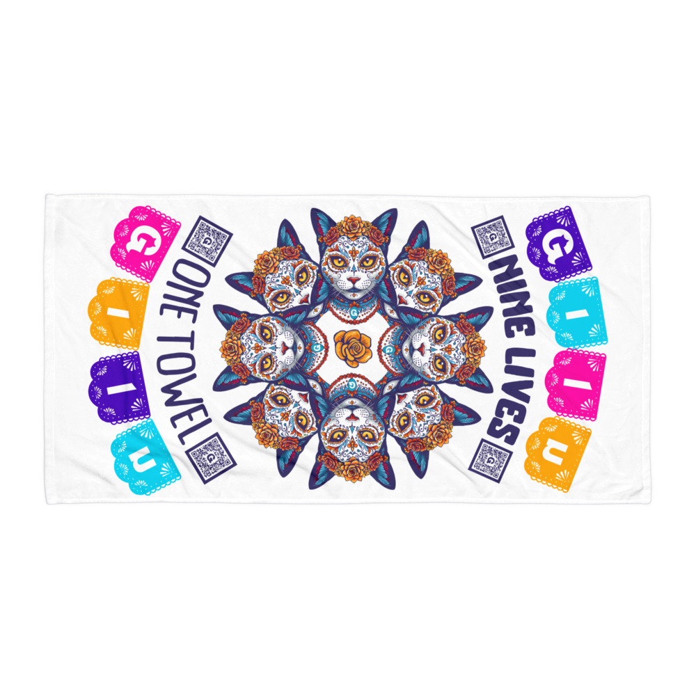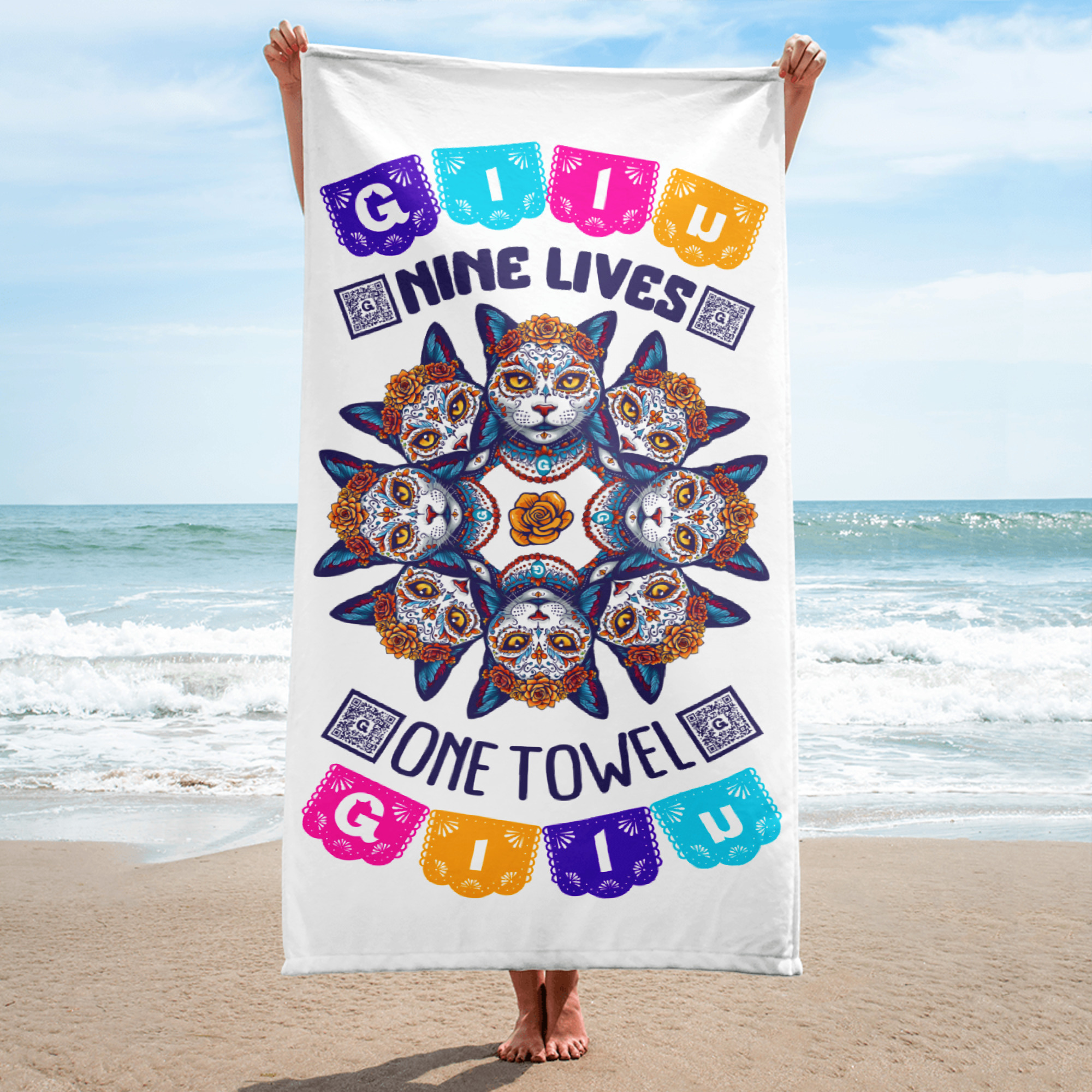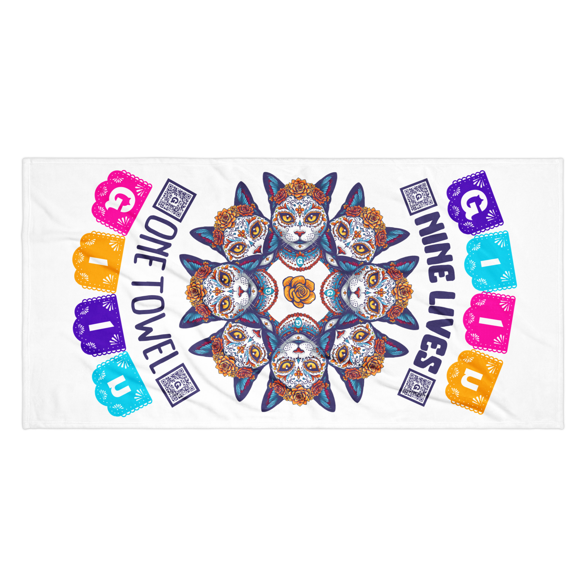Why settle for an ordinary towel when you can bring nine lives to the beach? The Nine Lives, One Towel features a kaleidoscope of sugar‑skull cats and vibrant papel picado, turning every swim or sunbath into a celebration of cattitude.